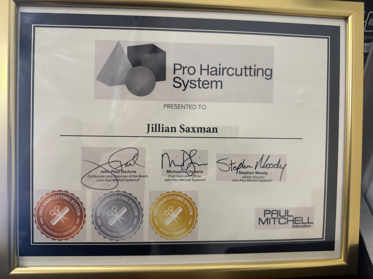 An award that recognizes profound mastery in haircutting was given to Jillian by the elite Paul Mitchell education organization. Her ongoing performance routinely shows her excellece in hair cutting tecniques, skill and education.